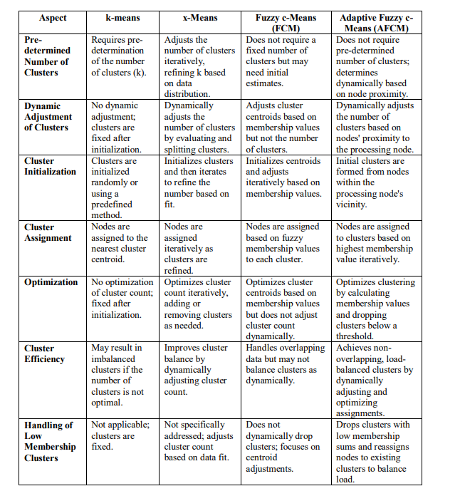 Table 3: Comprehensive Comparison of k-means, x-Means, Fuzzy c-Means (FCM), and Adaptive Fuzzy c-Means (AFCM): Key Aspects and Distinctive Features