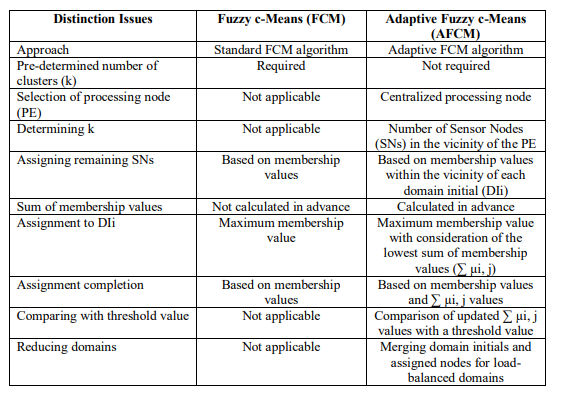 These distinctions highlight the key differences between the FCM and AFCM algorithms, emphasizing the adaptive nature of AFCM, which does not require pre-determining the number of clusters (k) and incorporates additional steps for processing node selection, assignment completion, and domain reduction to achieve load-balanced domains in sensor networks.