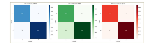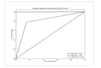 The following Figure 5 shows a comparison of the performance of the RNN, DBN, and hybrid models across important metrics. The results show that the hybrid model beats both solo models (RNN and DBN) across all evaluated metrics. This superior performance suggests that the hybrid model’s architecture, which integrates RNN for temporal analysis and DBN for complex feature extraction, offers a more robust approach to DDoS detection. The combination of these components enables the hybrid model to better capture both temporal dependencies and intricate feature correlations, resulting in improved adaptability and accuracy for detecting various DDoS attack types.