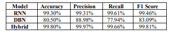 Table 1.Performance metrics comparison for RNN, DBN and Hybrid models