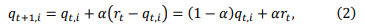 It follows from (2) that the updated value ππ‘+1,π is an internally dividing point between ππ‘,πand ππ‘ at ratio of πΌ: (1 β πΌ). Therefore, large πΌ may lead to drastic and unstable change of the value of ππ‘,π. Note that the value ofππ‘,β is unchanged for Slot β β π with no packet (re)transmission.