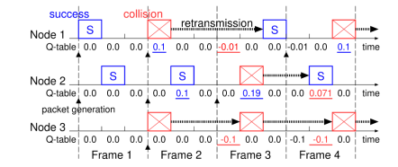 [Example 1] A simple example of ALOHA-Q is shown in Figure 1 for π = πΏ = 3, πΌ = 0.5, π succ = 1.0 and π fail = β1.0. Suppose that at Frame 1, Nodes 1 and 2 have their own packet and Node 3 has no packet to transmit. Nodes 1 and 2 randomly select Slot 1 and 2 for packet transmission, respectively, since πΈ1 = π. Both packet transmissions are successful, then the corresponding value is updated as π2,1 = πΌ = 0.1 at Node 1 andπ2,2 = 0.1 at Node 2. At Frame 2,Nodes 1 and 2 transmit their next packet in a slot with the maximum value in their Q-table. On the other hand, Node 3 randomly select a slot for packet transmission. Since two packets collide in Slot 1, Nodes 1 and 3 updates their Q-table as π3,1 = (1 β πΌ)π2,1 β πΌ = β0.01 at Node 1 and π3,1 = βπΌ = β0.1 at Node 3. Successful Node 2 increases its π2,2 = 0.1 to π3,2 = (1 β πΌ)π2,2 +πΌ = 0.19.