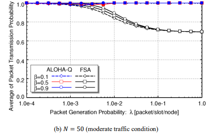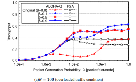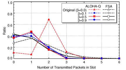 From Figure 5, it can be observed that idle slots of ALOHA-Q with π½ = 0.0 are about 10%, successful slots, which is equivalent to throughput, is less than 10%, and packet collision with two packets happens with ratio of around 70%.