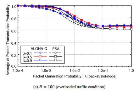 In consequence, from Figures 2-6 incorporation of adaptive transmission probability improves the performance of ALOHA-Q and FSA for the case of overloaded traffic condition and exhibits comparable performance to the original ALOHA-Q for the case of moderate traffic condition.