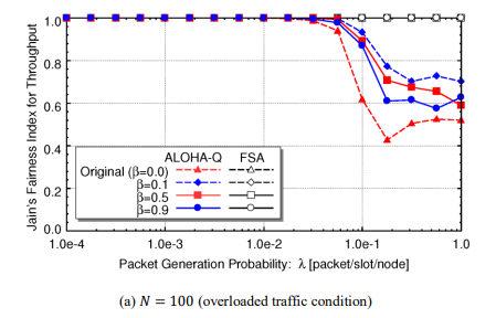 From the above observation, it appears that only a fraction of nodes succeeds in packet transmission and that the rest of nodes are likely to be included in packet collision or to defer packet transmission. In order to examine the fairness among nodes, in Figure 6 we show Jain’s fairness index [13] with respect to throughput. Jainβs fairness index is defined as