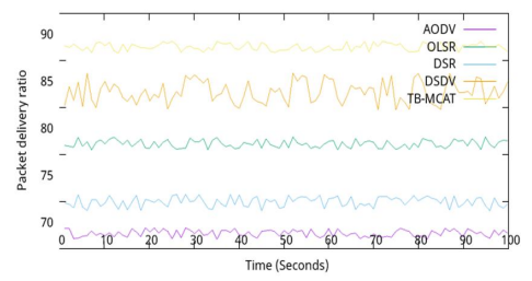 Simulation results indicate that the TB-MCAT protocol outperforms existing congestion-aware routing protocols in terms of packet delivery ratio, energy consumption, and delay. Specifically: Packet Delivery Ratio: TB-MCAT achieves a higher PDR than the benchmark protocols, especially in the presence of malicious nodes and under varying traffic loads. This improvement can be attributed to trust-based node selection and congestion-aware routing, which effectively avoided unreliable nodes and congested paths. Effective congestion management and utilizing disjoint paths achieved a 20% improvement in PDR compared to traditional protocols. Figure 2illustrates that with an increment in time, PDR increases too. OLSR and DSDV perform fairly well, but AODV and DSR show poor performance with an increase in the number of nodes.