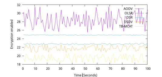 Encryption enabled refers to confidentiality and data integrity even if packets are intercepted. During evaluation, the Encryption Overhead is measured, examining: Encryption Time: The time taken to encrypt and decrypt each packet, which affects latency. Energy Consumption: Energy costs associated with encryption, impact network lifetime. Figure 5 illustrates that with an increase in time, the time taken for encryption is minimal with the proposed TB-MCAT. AODV and DSDV perform fairly well but OLSR and DSR show poor performance with an increase in the number of nodes.