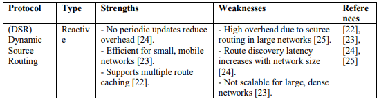 Several traditional routing protocols have been extensively studied in WSNs. The Ad hoc OnDemand Distance Vector (AODV) protocol [9] [12] is a reactive protocol that establishes routes only when needed. It reduces overhead but can suffer from high delays during route discovery. On the other hand, the Destination-Sequenced Distance Vector (DSDV) protocol [10] [13] is a proactive routing protocol that maintains a complete routing table at each node. While DSDV ensures quick route establishment, it can result in significant overhead due to frequent updates. The Dynamic Source Routing (DSR) protocol [11] uses source routing, where the entire route is included in the packet header. This approach eliminates the need for periodic updates but increases packet size. Finally, the Optimized Link State Routing (OLSR) protocol [12] [16] [17]is a proactive protocol that uses MultiPoint Relays (MPRs) to reduce overhead and efficiently disseminate routing information. OLSR is well-suited for dense networks but may not perform efficiently in highly dynamic topologies. Each of these protocols offers distinct advantages and limitations, highlighting the trade-offs between overhead, latency, and scalability in WSN routing. The integration of trust and congestion-aware mechanisms into these protocols can further enhance their applicability in modern WSNs. Table 1. shows a summarized comparison of the above protocols with their respective strengths and weaknesses