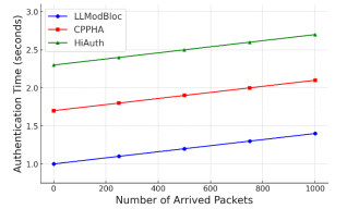 The time required to confirm a user’s identity by examining their credentials is known as the authentication time. Figure 3 displays the results of comparing the authentication time to the arrival of requests. Although the suggested LLModBloc uses computationally constrained lightweight techniques, it also protects the security credential’s secrecy. The main factor reducing the authentication time compared to the current works is the adoption of a lightweight method. Due to its flexibility, blockchain authentication speeds up authentication for larger packet requests. In LLModBloc, the average estimated time for authentication is 1 s, while in CPPHA and authentication handover, it is 1.7 s and 2.3 s, respectively. The processing time will be minimal even if the packet size is raised.