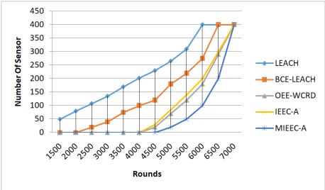 As stated in [30], network lifetime refers to the period during which the deployed sensors can monitor the target phenomenon. One way to measure this is by tracking the time when the first sensor depletes its power and ceases to function. This is an important metric for assessing how well a network can prolong its sensing period [31]. In Figure 1, the number of dead nodes within the network is compared. LEACH sees all sensors die by round 6000, BCE-LEACH by round 6300, IEEC-A by round 6800, andOEE WCRD by round 6900, whereas the proposed clustering algorithm MIEEC-A extends sensor life until round 7000. These results indicate that the proposed technique effectively maximizes network lifetime, as intended by the study