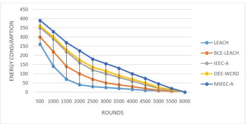 illustrates the objective of the fourth simulation, which provides an overview of energy consumption among network nodes using the LEACH, BCE-LEACH, IEEC-A, OEE-WCRD, and proposed clustering techniques MIEEC-A. The energy consumption rates differ among these protocols. The LEACH curve shows linearity for 950 rounds, BCE-LEACH for 1600 rounds, IEEC-A for 4710, OEE-WCRD for 4820 rounds, and the proposed technique for 4900 rounds. The results indicate that LEACH’s total node energy drops to nearly zero after 3500 iterations, BCE-LEACH maintains energy up to 5000 iterations, while IEEC-A and OEE-WCRD sustain energy until 5100 iterations, and the proposed technique until 5500 iteration. These findings support the claim that the proposed approach delivers better performance compared to conventional methods.
