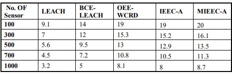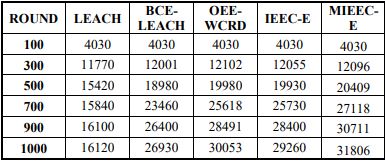 In the third simulation, the number of messages sent from the cluster heads (CHs) to the base station is calculated as a function of throughput. Table 4 presents the throughput for four existing protocols—LEACH, BCE-LEACH, IEEC-A,and OEE-WCRD, and compares them with the proposed clustering algorithm MIEEC-A.