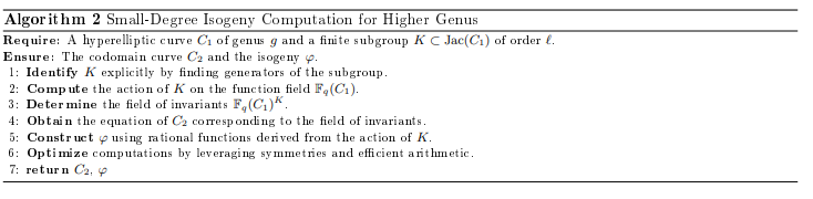 1. Development of E‑cient Algorithms: We introduce novel algorithms for computing isogenies between Jacobians of hyperelliptic curves, focusing on genus 2 and 3. These algorithms are optimized for e‑ciency and scalability, addressing the computational challenges inherent in higher-genus curves. We provide detailed pseudocode and explanations to facilitate understanding and implementation.