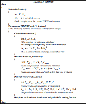 Following the method for allocating resources, the data from the nodes are broadcasted to the destination using the Hello routing function. The sub-nodes have a small amount of data to transmit while the CHs have a large amount of data. Once, the data rate has been allocated the specific sensor nodes start to broadcast the data. In the hello routing protocol, the Hello message that includes information is sent to the nearer neighbor node and maintains an internal neighborhood table. When the cluster head receives the data, the neighborhood table is updated. In this way, the information Nodes are sent to the sink node from the sensor via the selected CHs and then to the base station. The functions and process utilized in the proposed CHbHBG are explained in pseudocode format in Algorithm.1. The Algorithm inhibits all the expressions that are considered to complete the process of the QoS enhancement.