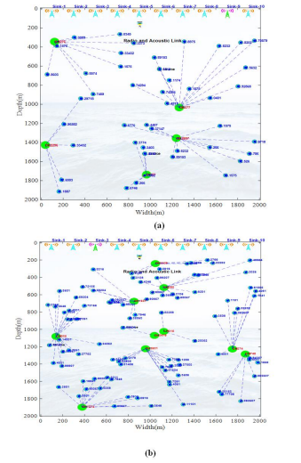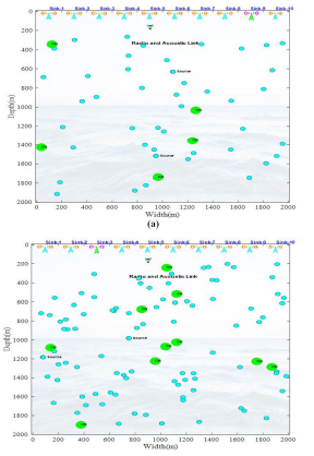 This study was conducted to understand the simulation process of the proposed CHbHBG model with step-by-step simulation results. The necessary nodes are first set up in the simulated environment. The node initialization process for 50 and 100 nodes is displayed in Fig.3. The initialized sensor nodes collect the information of the underwater.