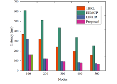 The comparison of latency values for varying nodes is shown in Fig.8. Here the latency values of the recommended CHbHBG model are compared with the conventional models such as TBRL and EEMCP. For the varying nodes the model TBRL attained the delay rate of 369.4ms, 319.6ms, 240.1ms, 198.6ms, and 159.4ms; also, the model EEMCP scored 610ms, 512ms, 436ms, 338ms, and 253ms. The model proposed model’s delay rate for nodes such as 100, 200, 300, 400 and 500 are 161.8484ms, 121.2393ms, 92.4923ms, 79.5943ms and 67.9194ms. The delay rate of the CHbHBG model is less than the existing models.