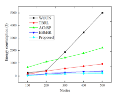 The energy usage comparison for the various methods is displayed in Fig.9. The EC values for the prevalent methods, namely WOUN, TBRL, and ACbRP, opposed to this, the suggested method use 48.4993 J, 113.1326 J, 165.496 J, 199.7867 J, and 230.8441 J for 100 to 500 nodes. The resulting values of CHbHBG uses less energy than other existing methods for all different numbers of nodes.