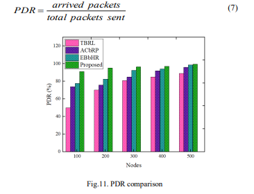 The PDR is determined by the ratio of adding together all of the data packets that arrive at the SH to the packets that leave the source nodes. The ratio of all transmitted packets from the source to all packets reached at the SH is used to calculate it. The formula for calculating average PDR is found in Eqn. (7).