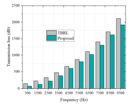 Fig.12. compares the transmission loss with the current protocol, TBRL. The suggested CHbHBG approach obtained a relatively low frequency of transmission loss for each variable when compared to the TBRL method. 71.445 dB, 127.009 dB, 223.259 dB, 387.31 dB, 601.59 dB, 798.782 dB, 1021.908 dB, 1302.295 dB, 1616.716 dB, and 1918.469 dB are the transmission losses that the proposed CHbHBG achieves for various frequencies, including 500 Hz, 1500 Hz, 2500 Hz, 3500 Hz, 4500 Hz, 5500 Hz, 6500 Hz, 7500 Hz, 8500 Hz, and 9500 Hz. Compared to other protocols, the presented routing model provided a very low transmission loss.
