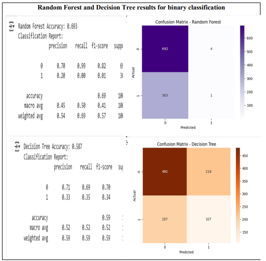 The classification performance of four models – Random Forest, Deep Neural Network (DNN), Convolutional Neural Network (CNN), and Decision Tree – was evaluated based on accuracy and classification metrics. Random Forest demonstrated the highest accuracy (69.3%), while Decision Tree had the lowest (58.7%). The neural network-based models, DNN and CNN, exhibited similar performance, with accuracies of approximately 59.5% and 59.2%, respectively. Further analysis of precision, recall, and F1-score revealed critical insights into model behaviour across different classes. For the majority class (class 0), Random Forest achieved the highest recall (99%), indicating strong identification capabilities; however, this also suggested a potential bias towards the dominant class. In contrast, DNN, CNN, and Decision Tree reported lower recall values of 75%, 73%, and 69%, respectively. Performance on the minority class (class 1) highlighted significant weaknesses in Random Forest, which failed to identify any class 1 instances (0% recall). Decision Tree outperformed other models in class 1 recognition, achieving a recall of 35%, followed by CNN (28%) and DNN (24%). While Random Forest exhibited the highest overall accuracy, its extreme bias towards the majority class makes it unsuitable for applications requiring fair classification across classes. Conversely, Decision Tree provided a more balanced classification but at the cost of lower overall accuracy. The neural network models, DNN and CNN, yielded nearly identical accuracy scores, suggesting that deep learning techniques did not significantly outperform traditional approaches in this dataset.