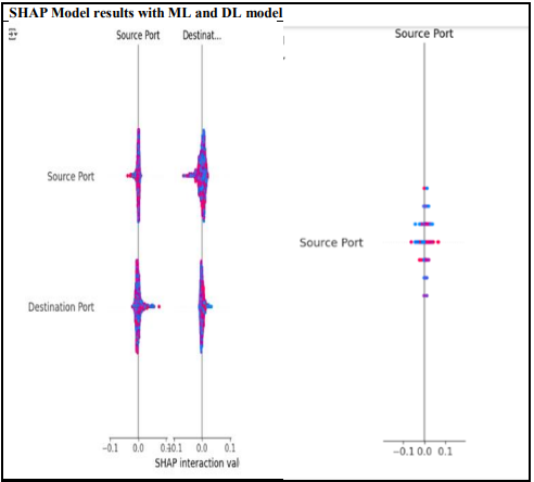 The SHAP (SHapley Additive exPlanations) results provide valuable insights into the influence of key features, particularly source port and destination port, in both machine learning (ML) and deep learning (DL) models, highlighting differences in feature impact and interpretability. In ML models, the SHAP values for these features exhibit a more distributed impact, with significant variations along the SHAP interaction value axis. The density of these values suggests that both features contribute meaningfully to model decisions, with a balanced influence rather than extreme dependence. In contrast, the DL model shows a more concentrated impact on the source port, with the majority of SHAP values clustered around a narrower range. This indicates that the DL model places greater emphasis on this feature while potentially disregarding other factors or generalizing differently compared to ML models. The broader spread of SHAP values in the ML model implies a more dynamic contribution of source and destination ports to predictions, enhancing interpretability and making decision-making more transparent. Conversely, the DL model’s strong emphasis on the source port raises concerns about over-reliance on a single feature, which may lead to a lack of generalization and potential overfitting. This distinction underscores the trade-off between interpretability in ML models and the complexity of DL models, where the latter may capture non-obvious patterns but at the cost of reduced transparency. The heavy dependence of the DL model on source port suggests possible vulnerabilities, as adversaries could manipulate this feature to evade detection. In contrast, the ML model’s balanced feature contribution may offer better generalization across different network traffic scenarios. Given that source and destination ports play a crucial role in network traffic classification, their importance in both models reinforces their relevance in distinguishing between benign and malicious traffic.