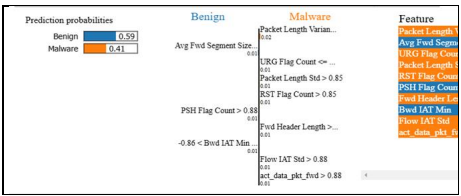 LIME (Local Interpretable Model-agnostic Explanations) results show the impact of different features on the probabilities of classifying a sample into the Benign and Malware categories, providing deeper insight into how the model makes its decisions. According to the analysis