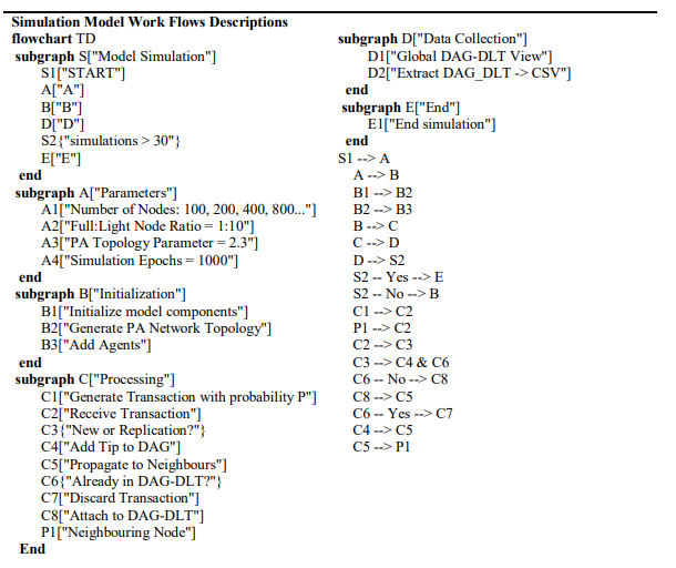 The Error! Reference source not found. shows the design of the IoT-DAG-DLTSim model, which simulates a decentralised ledger system using a directed acyclic graph (DAG) architecture within a scale-free network topology. Initialisation begins by defining critical parameters: network size (ranging from 100 to 6400 nodes), a 1:10 ratio of full to light nodes, and a powerlaw topology (γ = 2.3) to emulate real-world peer-to-peer networks. Each simulation epoch executes a transaction lifecycle where nodes probabilistically generate transactions, which are validated and appended to the DAG as new tips. Transactions may be received from neighbouring nodes, and the receiving agent checks if they are already attached and appends them to the DAG ledger or discards them if duplicates are detected. Valid transaction as sent to neighbouring nodes through a gossip-based propagation protocol. The model captures global state snapshots at each epoch, and at the end of the experiment, extracts performance metrics including Mean Transaction Latency (MTL), Confirmed Transactions Per Second (CTPS). To ensure statistical reliability, the simulation iterates 30 times per parameter set, with outputs exported to structured datasets for analysis. This design enables the study of emergent behaviours in heterogeneous networks while quantifying trade-offs between latency, throughput, and network growth dynamics under varying conditions.