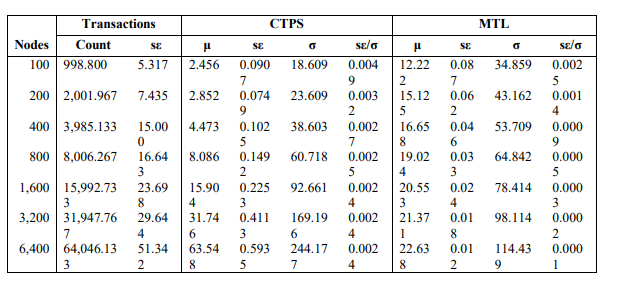 At the onset, a comprehensive simulation was conducted across varying node counts to evaluate the impact on key performance metrics, including CTPS, MTL, and horizontal scalability. The experiment took a total of 32.79 hours with a standard error (SE) of 0.16 and a standard deviation (SD) of0.63 to run the complete sets of simulations as shown in Table 4.