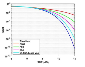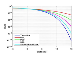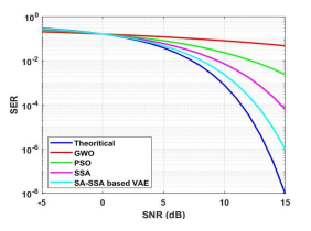 The proposed SA-SSA based VAE method is compared to existing techniques like HPT-SSAE [20], HybridโPTS [21], TDS-IM-OFDM-SS [22] and C-ANN [23] under various sub-carriers like 64, 128, 256, 512 and 1024. The comparisons are performed based on characteristics of BER, SER, and PAPR (dB) which are represented in Table 2. The proposed SA-SSA based VAE method attained less BER, SER and PAPR than other existing methods which are compared.
