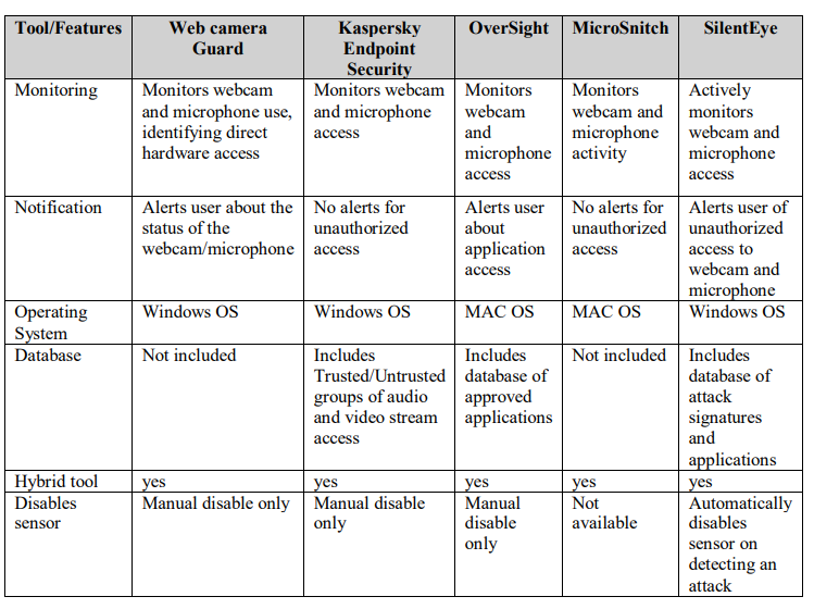 Microphone Lock: An application that enables users to disable microphone permissions for specific applications at designated times. While it provides user control over microphone activation, it does not offer protection for webcams and requires manual microphone management, which makes it less suitable for users seeking automated solutions [No specific source identified]. The limitations of existing tools highlight the need for a comprehensive solution like SilentEye. The table below provides a comparative overview of their capabilities and how SilentEye addresses these gaps.