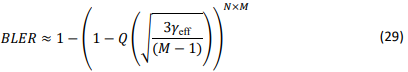 The Block Error Rate (BLER) in an Orthogonal Time Frequency Space (OTFS) modulation system depends on several factors, including signal-to-noise ratio (SNR), modulation scheme, channel conditions, and receiver equalization techniques. Below is a mathematical formulation of how BLER is modeled in an OTFS system.