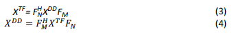 An OTFS transmitter can be described by a matrix representation, facilitating software or hardware implementation. It starts with a more condensed form of the ISFFT as shown in Eq 1. We can obtain this equation by the DFT matrices FN∈C N×N and FM∈C M×M. If X DD∈C N×M includes the symbols x(k, l) representing the DD domain and X 𝑻𝑭∈C N×M includes the symbols Xtf(n,m) of the TF domain.