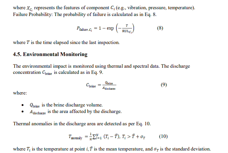 During this data collection process, UAVs and IoT sensors obtain multi-modal information. Thermal and optical, high-resolution images, 3D LiDAR point clouds, and real-time sensor readings are logged and sent to a cloud-based platform. Where thermal cameras detect heat signatures, LiDAR scans offer structural assessments. IoT solution sensors monitor parameters of the operation such as salinity and temperature for the plants to work at optimal levels. Next, the raw data collected is then pre-processed. Images are subjected to noise reduction using Gaussian filters while all images are sized to a standard format. Redundant data points are removed from the LiDAR point clouds, and the sensor readings have been normalized to mitigate the scaling variation and outliers. The dataset is available at: https://www.kaggle.com/datasets/kavinxavier/desalination-plant-data-usa?utm_source=chatgpt.com The above dataset includes sensor readings, water quality metrics, and maintenance logs, aligning with our AI-driven predictive maintenance framework. We have detailed the preprocessing