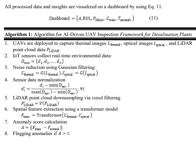 The UAVs employed in this framework are selected based on their ability to enable advanced sensors and imaging on-board. These UAVs are equipped with thermal cameras that reveal temperature anomalies, LiDAR sensors that produce high-resolution 3D maps of plant structures, and IoT-enabled devices for real-time measurement of environmental parameters such as salinity, temperature, and humidity. They are also fitted with robust GPS systems and large enough batteries, designed to allow for long missions inspecting large-scale desalination plants. These UAVs achieve autonomous navigation thanks to SLAM algorithms, which allow the flying robots to map the environment and estimate obstacle avoidance to avoid them in real time. Preprogrammed flight paths ensure that data is gathered systematically over critical plant areas such as pipelines, storage tanks and heat exchangers. Transformers technique is used that excel in capturing long-range dependencies, integrating multi-modal sensor data, and adapting to dynamic environments, making them ideal for UAV-based inspections. Compared to CNNs, which focus on local spatial features, transformers effectively combine UAV imagery, LiDAR data, and sensor readings to enhance anomaly detection accuracy.