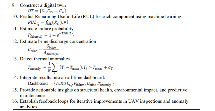 The last step of the methodology consists of the processing and visualization of the data in realtime. Data gathered by UAVS and sensors are processed on a cloud-based platform. The information is processed and displayed on an interactive dashboard, giving stakeholders usable results. Key metrics, including structure health, environmental data, and predictive maintenance schedules, are depicted in the dashboard. The ability to monitor in real time allows us to make informed and timely decisions, assuring that desalination plants continuously in optimal operating conditions.