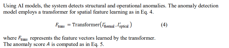 environmental monitoring. The mathematical formulations in our anomaly detection and predictive maintenance models by explicitly defining all parameters and their roles in UAVbased inspections. The anomaly detection model clearly outlines how thermal images, LiDAR scans, and sensor readings are transformed into feature vectors using a transformer-based model. Additionally, we have expanded the predictive maintenance equations, defined componentspecific features and elaborated on failure probability estimation. Below are the detailed mathematical formulations.