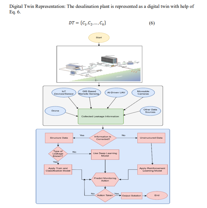 Digital twins are virtual representations of physical systems that enable real-time simulation, fault analysis, and maintenance planning. The technology has been successfully implemented in manufacturing plants and energy systems to enhance operational efficiency and predict failures [21]. Recent work in water management integrates digital twins with IoT and UAVs for monitoring reservoirs and detecting leaks [22,23]. Despite their increasing usage, the development of digital twins in desalination plants is still in its infancy but has the potential to bring a new revolution in maintenance strategies and cost reduction [24].