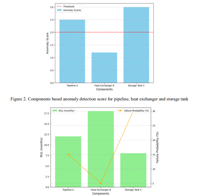 Figure 3 shows the predictive maintenance capabilities of the framework, showing the RUL and failure probabilities of the same components. Pipeline A has a RUL of 12 months and a 15% failure probability, while Storage Tank C has the shortest RUL with 8 months and a 30% failure probability. Heat Exchanger B, with an RUL of 18 months and a failure probability of only 5%, presents a comparatively lower risk profile. These insights, derived from the digital twin of the plant, enable targeted maintenance scheduling and resource optimization.