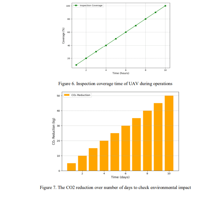 Figure 7 demonstrates the accumulative reduction of CO₂ emissions obtained through deploying UAVs for the inspection instead of conventional methods. In the 10-day duration, the UAV-based operations tend to decrease gradually in CO₂ emissions and reach 50 kg on the 10th day. This enormous reduction is highly justified because the operation of UAVs is energy-efficient compared to the conventional methods of inspection that involve fuel-based equipment with