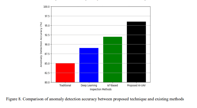 5. Improved Anomaly Detection Accuracy: The proposed UAV framework achieves an anomaly detection accuracy of 93.5%, significantly surpassing the 85.0% accuracy of traditional visual inspection methods. This improvement is attributed to the integration of advanced AI algorithms, such as transformers and CNNs, which enhance the precision of defect detection.