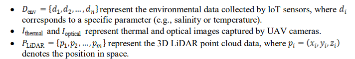 UAVs equipped with sensors capture various data streams such as temperature, salinity, humidity, and structural images. Let: