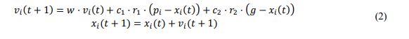 where 𝑤 is the inertia weight, 𝑐1 and 𝑐2 are acceleration constants and 𝑟1 and 𝑟2 are random