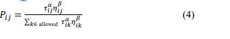 where 𝜏Is the pheromone level, 𝜂 is visibility and 𝛼, 𝛽 are constants.