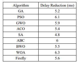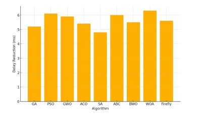 The results of the performances for delay minimization are recorded in Table 3, where again WOA and PSO gave the best performances. WOA was at the leading edge, having reduced the delay by 6.3 milliseconds, closely tagged by PSO at 6.1 milliseconds. A comparison is explicitly shown in Figure 2, the leading role played by WOA in latency reduction. This will make WOA an optimal candidate for applications with strict latency bounds, such as the Ultra-Reliable LowLatency Communication slices that enable real-time communication. The strong performance of the PSO in delay reduction underlines its efficiency in fast convergence through solution spaces, a particular trait of interest in delay-sensitive network environments. ABC also fared well, with a delay reduction of 6 milliseconds, proving effective in delay optimization-critical applications. Herein, the design in WOA resorts to a balanced exploration method for the purpose of searching the solution space, while PSO basically relies on collective swarm behavior in view of adaptation to changed circumstances, which is especially useful when it comes to minimization of delay.