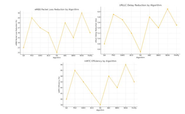 For packet loss reduction in the eMBB slice, WOA had the highest packet loss reduction rate of 30%, while PSO and ABC followed very closely with packet loss reductions of 29% and 28%, respectively. These esults highlight the ability of WOA and PSO to maintain high-throughput data transmissions, a key equirement in this niche of eMBB, extending its applications in video streaming and large-size data transfer. ABC performs better in packet loss reduction, matching well with the needs brought about by eMBB since their exploration and exploitation are wellbalanced in maintaining data integrity over extensive periods. On the other hand, GA and SA have lower rates of packet loss reduction and thus seem to be poorer options for applications with high-throughput demands. Speaking about the URLLC slice, which requires very low latency, WOA again outperformed others with a delay reduction of 6.1 ms, closely followed by PSO and ABC, with 5.9-ms and 5.8-ms delay reductions, respectively. Better performance in delay minimization proves their highly desirable usage in real-time applications such as emergency response systems and autonomous driving at scale. The strict latency requirement of URLLC requires the operated algorithm to converge fast, which is fulfilled by WOA and PSO, attested by the consistently low delay metrics. Other algorithms like SA and GA perform with lower delay reduction and have to find other applications in delay-insensitive scenarios since they are not fit for latency-sensitive applications.