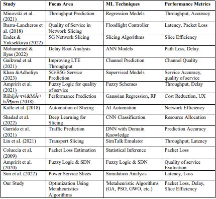 This evolution to 5G from the LTE networks has ensured that performance optimization now rapidly strides with the power of machine learning and AI techniques. It has succeeded in handling and predicting major performance parameters related to throughput, latency, packet loss, and network slicing. A wide variance in research methodologies and findings is presented in the literature that extends our knowledge of cellular network performance optimization. In Minovski et al. [26] they propose a machine-learning model for predicting cellular link throughput in both LTE and 5G networks. They presented a model tested in urban, suburban, and rural environments, achieving high prediction accuracies: 93% for TE and 84% for nonstandalone 5 G. Thereby, this research underlines the potential of ML for real-time enchmarking and points toward promising applications for standalone 5G. On a similar note, Endes and Yuksekkaya,[9] used ML algorithms to optimize user allocation among the various slices of ommunication. It has been demonstrated that substantial improvements in resource utilization and automated slice management are achievable. Network slicing has been explained by IbarraLancheros et al. [15] as one of the most critical enabling technologies for 5G. Using the Floodlight controller, based on a software-defined methodology, it is shown that reduced packet loss of up to 10% can be achieved with educed latency, hence effective in VoIP and other realtime applications like video transmission. meanwhile, Mohammed and Ilyas [29] did the delay root cause analysis on LTE by considering environmental reasons, such as weather conditions, in their ML models to understand and mitigate latency and path loss.