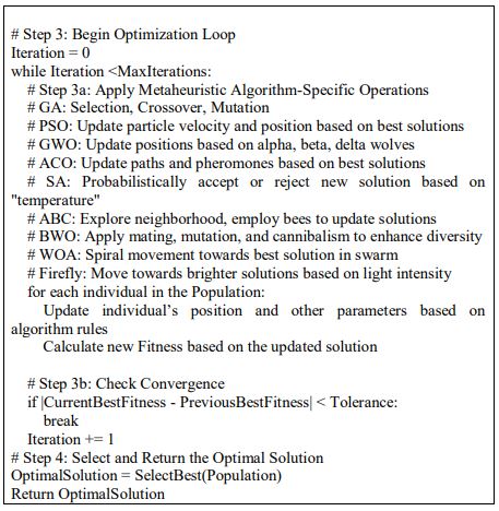 where 𝑡Denotes the iteration index. This criterion prevents the optimization process from continuing indefinitely by establishing a stopping point once the solution stabilizes, a method widely adopted in network optimization research [6].To implement this approach for all the various algorithms, we designed a general framework that standardized the processes involved in each, including initialization, fitness evaluation, update operations, and convergence checks. The unified pseudocode is given below, with some adjustments according to the characteristics of each algorithm: