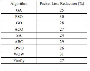 Indeed, the effectiveness mechanism of WOA for solution exploration underlies the spiral updating combined with bubble-net hunting and turns out to be efficient in solution space exploration, converging towards the best solution to the problem. The adaptability of PSO in a complex optimization environment is one more important reason for the high capability of packet loss reduction, where the cooperative behaviors of particles maintain packet reliability. ABC performed the foraging behavior to balance exploration and exploitation, demonstrating its suitability for minimum packet loss. Other performing algorithms included GWO, with a 28% reduction, and ACO, with a 27% reduction, though this did not quite reach the top-tier reductions observed with WOA, PSO, and ABC. This performance comparison depicts the robustness of some metaheuristic algorithms in packet reliability optimization. Among others, the most viable options were WOA, PSO, and ABC. The contribution of these algorithms to packet loss reduction forms part of the adaptiveness of algorithms in diverse networking conditions, especially in hightraffic networking scenarios when packet reliability becomes critical.