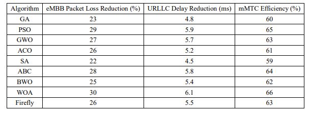 Besides these results, the study underlines the importance of using an adaptive optimization approach for handling modern mobile networks, which are complex by nature and dynamic in behavior. The overall superior metrics of WOA and PSO, in terms of much-reduced packet loss and delay, stress the crucial role of algorithm selection that efficiently balances the dilemma of exploration versus exploitation. The results indicate that optimal resource utilization and efficient user experiences could be facilitated through staging algorithmic schemes based on specific requirements raised by slices. WOA and PSO thus improve critical metrics by more than 30%, so network operators may make critical choices to stage these algorithms for latency-sensitive use cases. This work has presented a quantitative framework to improve the reliability and responsiveness of networks; further research should be performed in the direction of hybrid and real-time optimization techniques to meet even more stringent performance benchmarks to