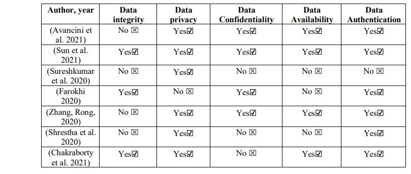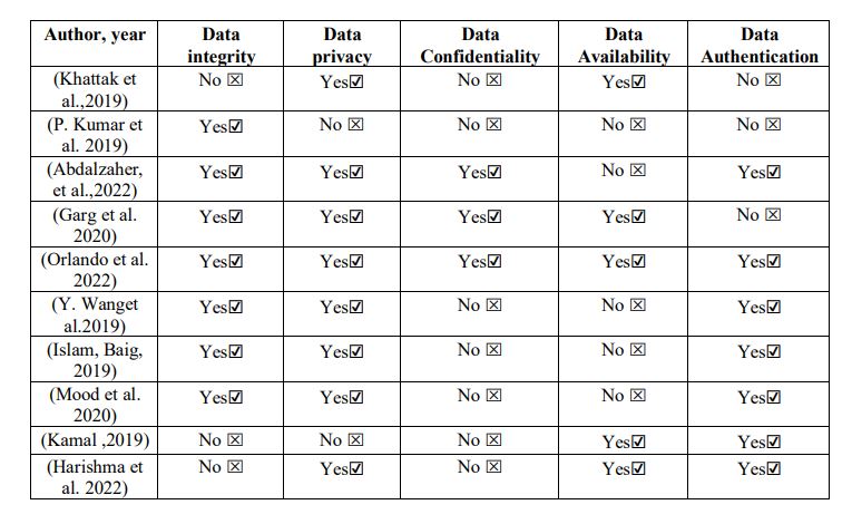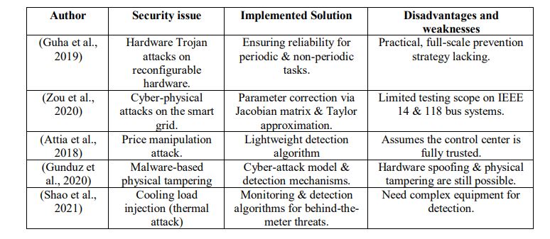 Table 4 provides an overview of the main security concerns identified across various studies in the context of smart meters. Specifically, it summarizes which core security properties, namely data integrity, data privacy, data confidentiality, data availability, and data authentication, have been addressed or highlighted as areas of concern by different authors. This comparative analysis includes contributions from recent literature spanning multiple years, reflecting the evolving focus and priorities in smart meter security research. The presence or absence of attention to each security property is indicated for each referenced work, thereby enabling a clear understanding of the current research landscape and revealing potential gaps that warrant further investigation. This table serves as a valuable reference for identifying trends and directing future efforts toward more comprehensive and balanced security frameworks in smart metering systems.